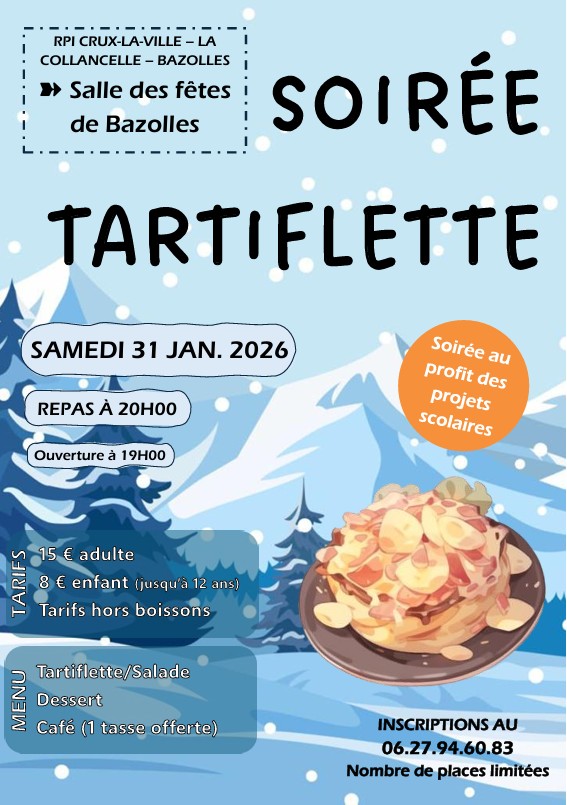 Les écoles du Regroupement Pédagogique Intercommunal organisent une soirée tartiflette au profit des coopératives le samedi 31 janvier 2026 à la salle des fêtes de Bazolles.